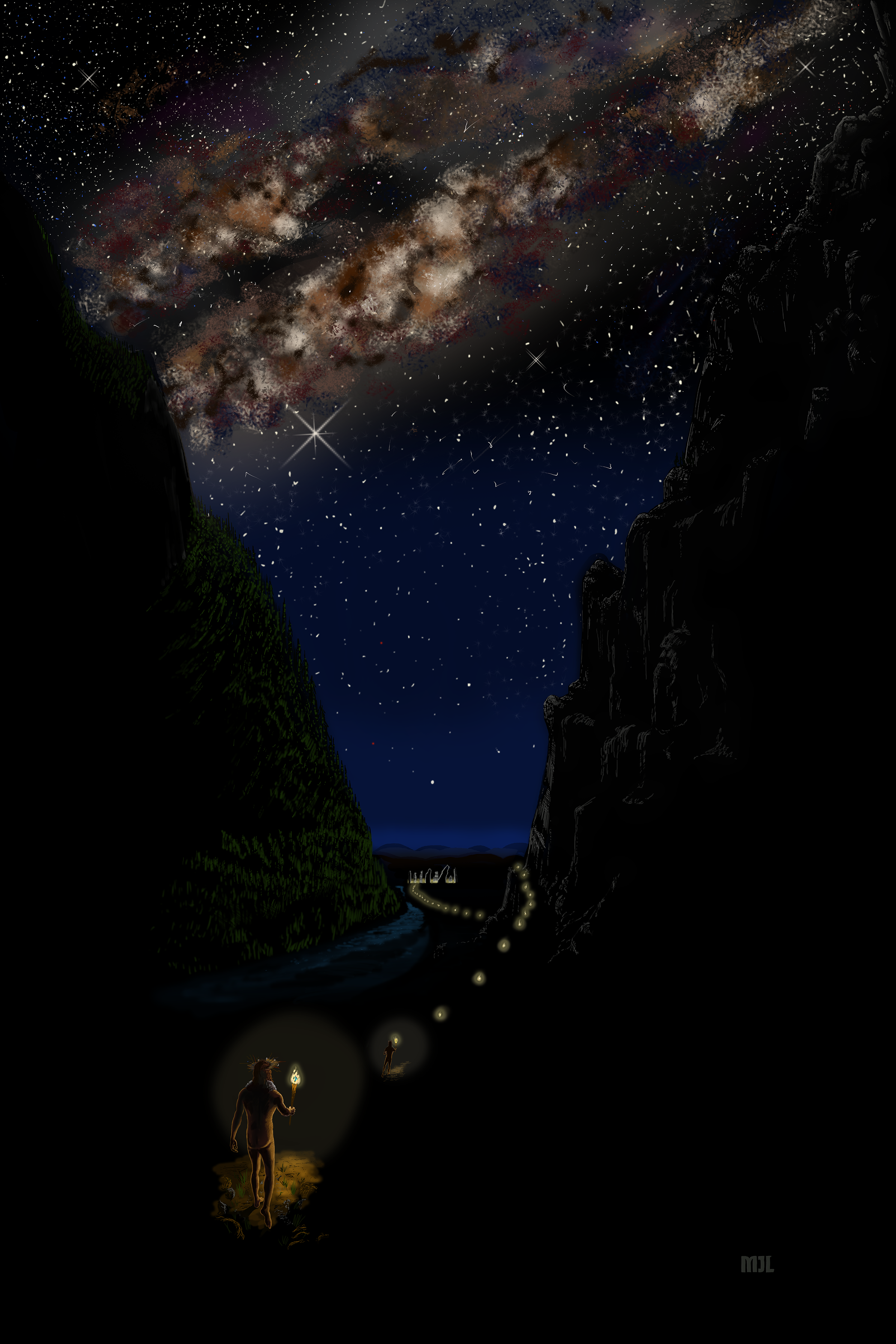 These monolith sites were all removed and separated from townships and villages, hence a procession would most certainly have been a part of the rituals and ceremonies – arriving would have been a large part of the proceedings, by their nature, hence I feature the procession as the main action of the composition. What took place at the Monument we don’t know, hence I don’t feature it here – we just know that they congregated at these sites seasonally. The areas of occupation would have been in the shelter of the valleys and the forests, and hence I feature the population leaving this environment, onto the open plains where these monuments were constructed. The procession takes the individuals through a pass in the mountains, then down to the open plain by the banks of the river.